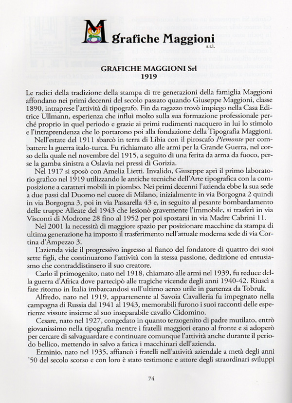Le radici della tradizione della stampa di tre generazioni della famiglia Maggioni affondano nei primi decenni del secolo passato quando Giuseppe Maggioni, nel 1919, intraprese l’attività di tipografo a pochi passi dal Duomo di Milano utilizzando le antiche tecniche dell’ Arte tipografica con la composizione a caratteri mobili in piombo.